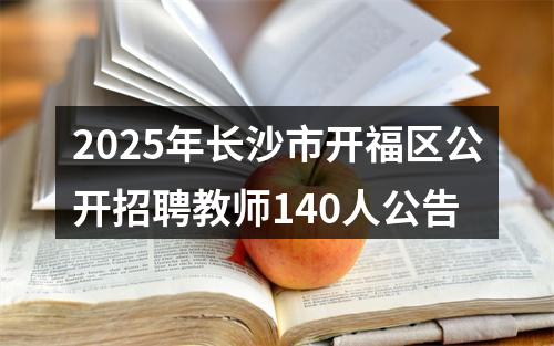 根据《事业单位人事管理条例》(国务院令第652号)、《湖南省事业单位公开招聘人员办法》(湘人社规〔2025〕1号)文件精神,为进一步促进开福教育事业发展,落实教师卓越工程,着力打造“优质教育资源聚集区”,争创国家义务教育优质均衡发展区。经区委、区政府研究,决定面向社会公开招聘教师140名。现将开福区2025年公开招聘教师有关事项公告如下: