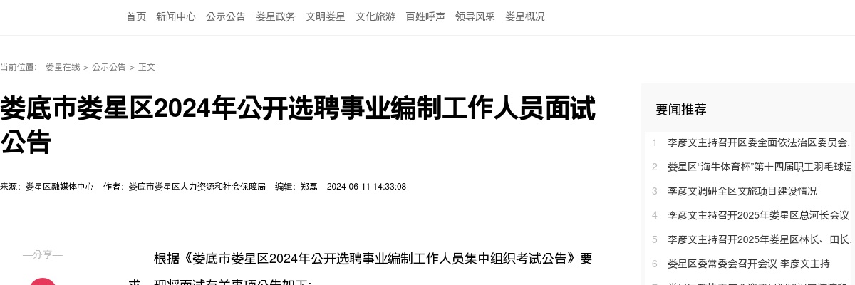 原标题:娄底市娄星区2024年公开选聘事业编制工作人员面试公告